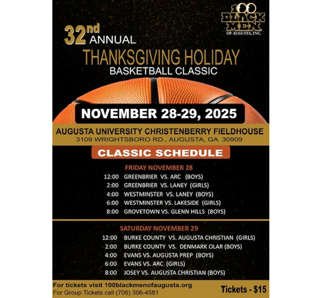 It's time for The 32nd Annual Thanksgiving Holiday Basketball Classic. at Augusta University Christenberry Fieldhouse. Tickets are $15.00 at www.100blackmenofaugusta.org For group tickets call (706)306-4581